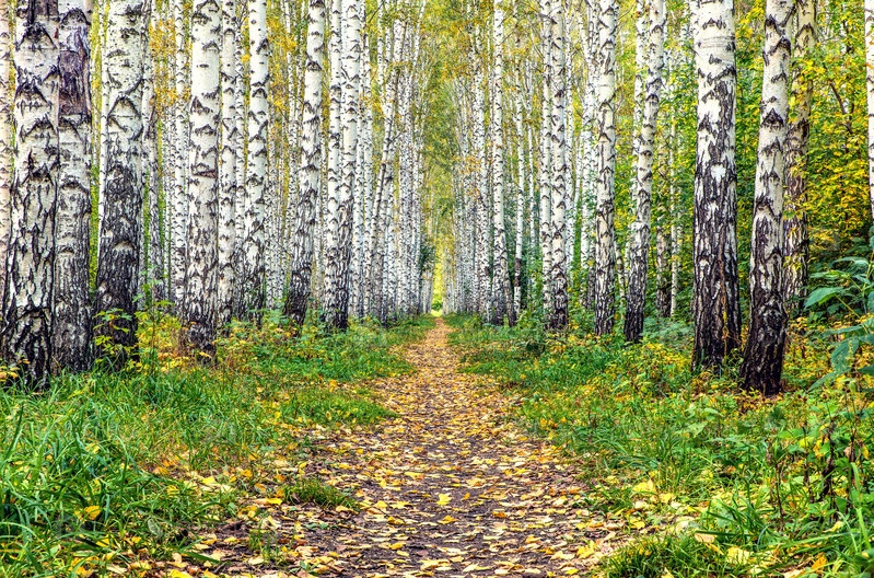 Тропа в осенней березовой роще. Лесной пейзаж белых берез