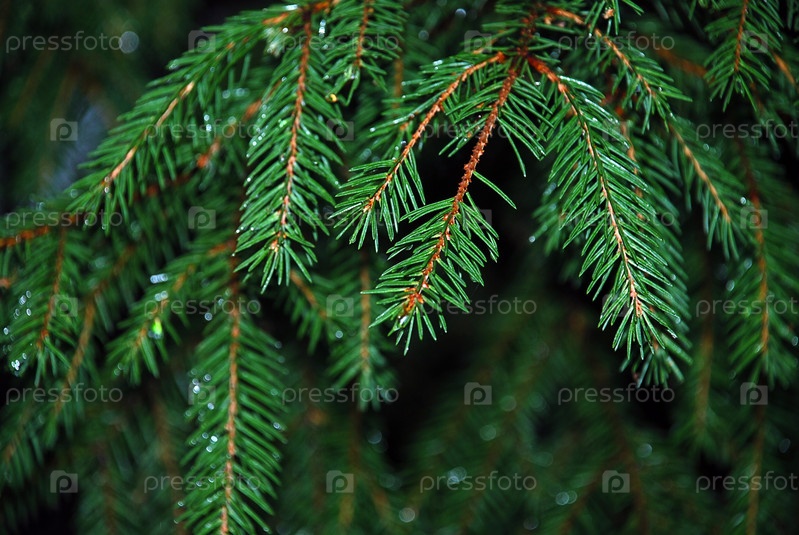Мокрые еловые ветки. Пасмурный осенний день, идет дождь. На длинных коричневых ветвях ели растут короткие тонкие зеленые иголки. Капли дождевой воды застряли в иголках