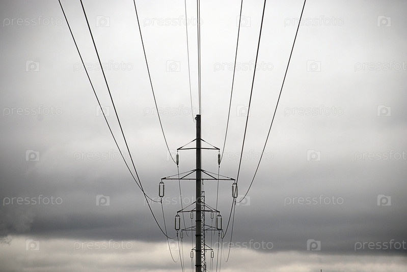 Высокий бетонный электрический столб. Пасмурный осенний день, небо затянуто серыми непроглядными тучами. Имеется высокий багажник, в котором проходят электрические провода высокого напряжения