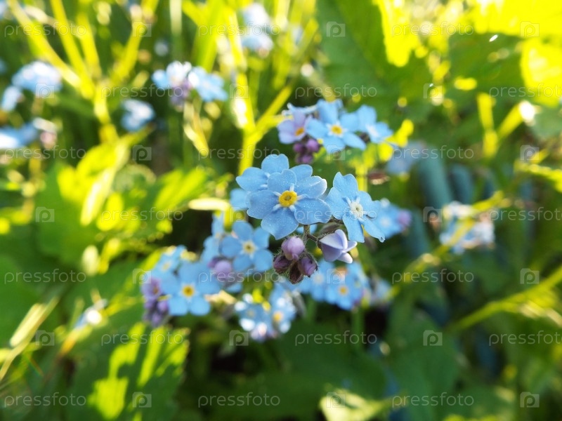 Цветы Незабудки в траве на лугу летом