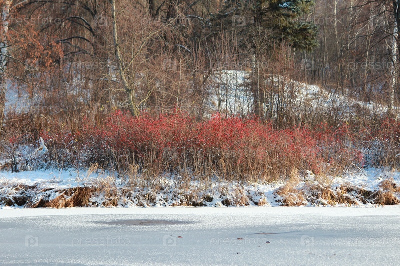 Красные ягоды на берегу замерзшей реки