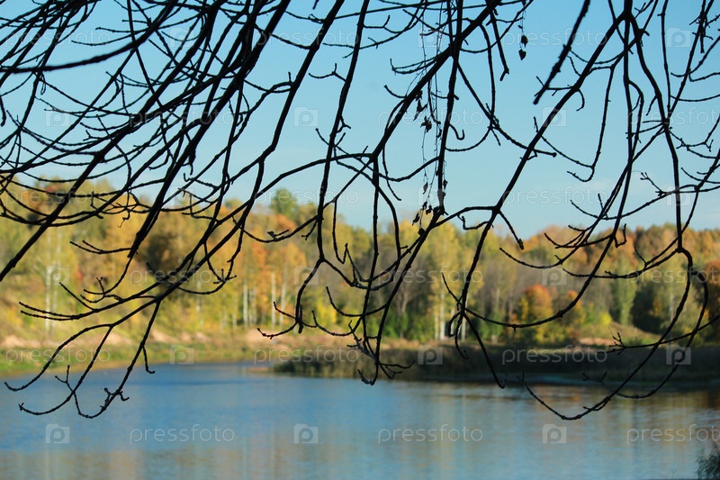 Вид на берег реки сквозь ветви дерева
