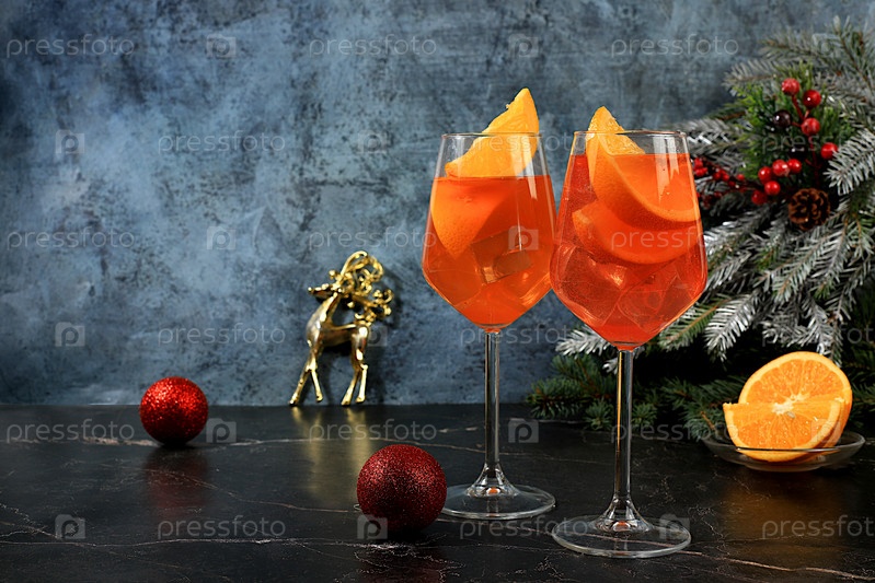 Рождественский алкогольный коктейль Aperol spritz в стаканах на праздничном фоне с ветвями елки и украшениями, концепция бара и канун Нового года, спиртные напитки на вечеринке,