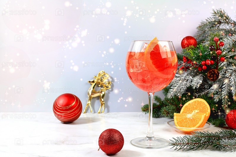 Рождественский алкогольный коктейль Aperol spritz в стаканах на праздничном фоне с ветвями елки и украшениями, концепция бара и канун Нового года, спиртные напитки на вечеринке