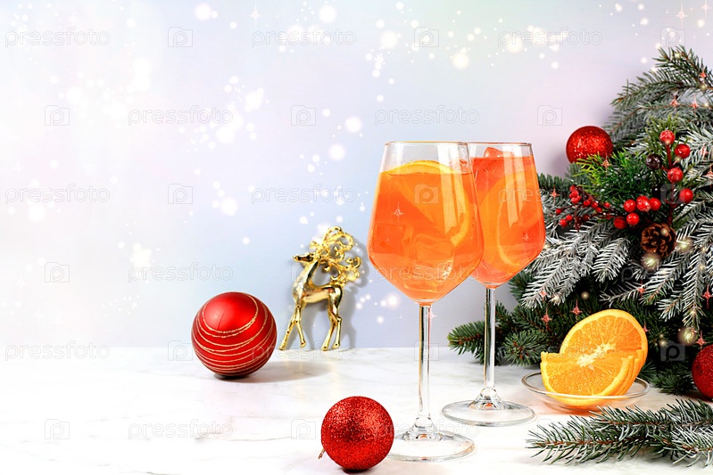 Рождественский алкогольный коктейль Aperol spritz в стаканах на праздничном фоне с ветвями елки и украшениями, концепция бара и канун Нового года, спиртные напитки на вечеринке