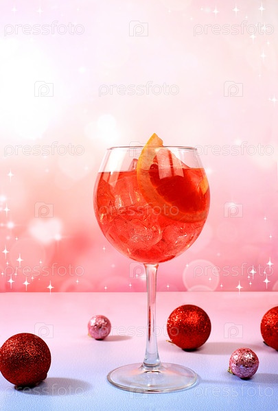 Рождественский алкогольный коктейль Aperol spritz в стаканах на праздничном фоне с ветвями елки и украшениями, концепция бара и канун Нового года, спиртные напитки на вечеринке,