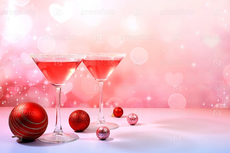Рождественский алкогольный коктейль с красным мартини, лимонадом, шампанским в бокалах на праздничном фоне с еловыми ветками и украшениями, концепция бара, алкогольные напитки на вечеринке,