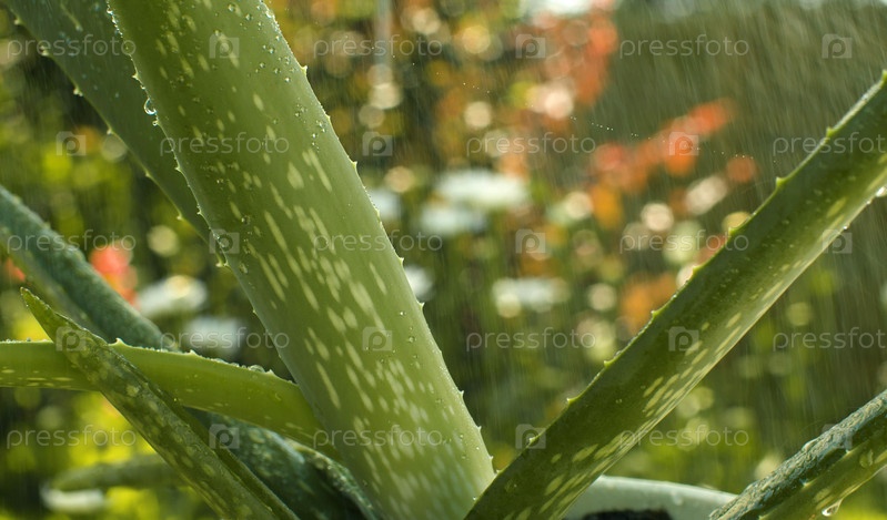Растение алоэ вера в горшке под дождем