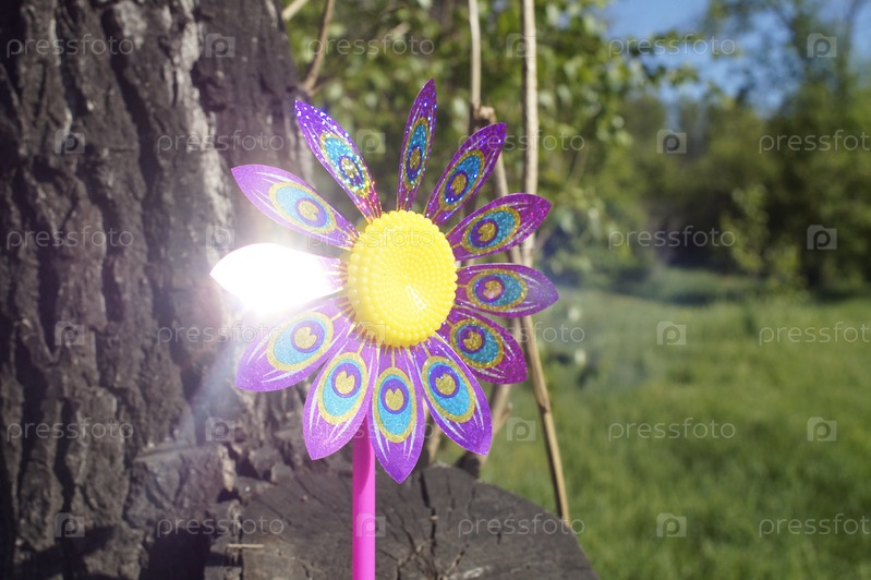 Детская игрушечная ветряная мельница на фоне леса