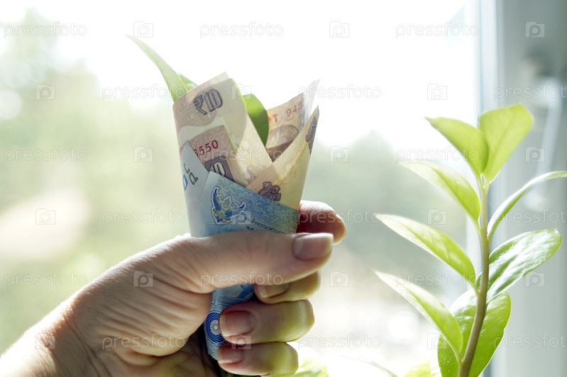 Деньги, скрученные в сумку с листьями растения