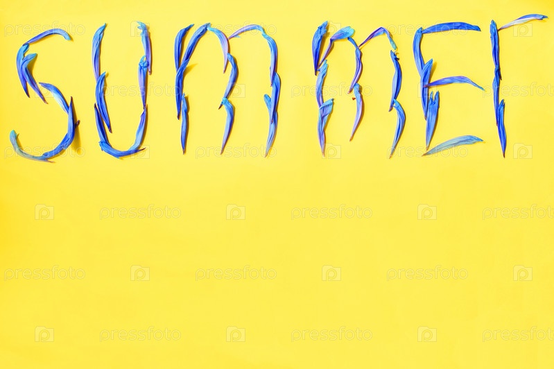 Слово лето состоит из голубых лепестков хризантемы на желтом фоне