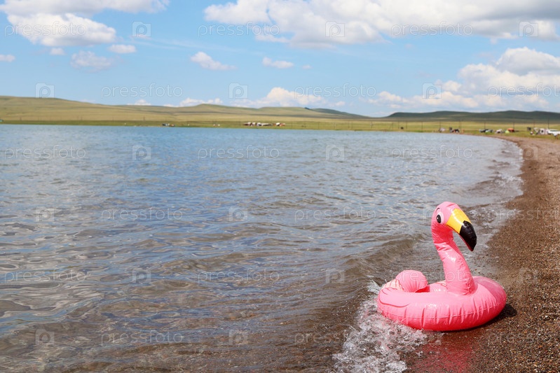 Надувной круг в форме розового фламинго на песчаном пляже