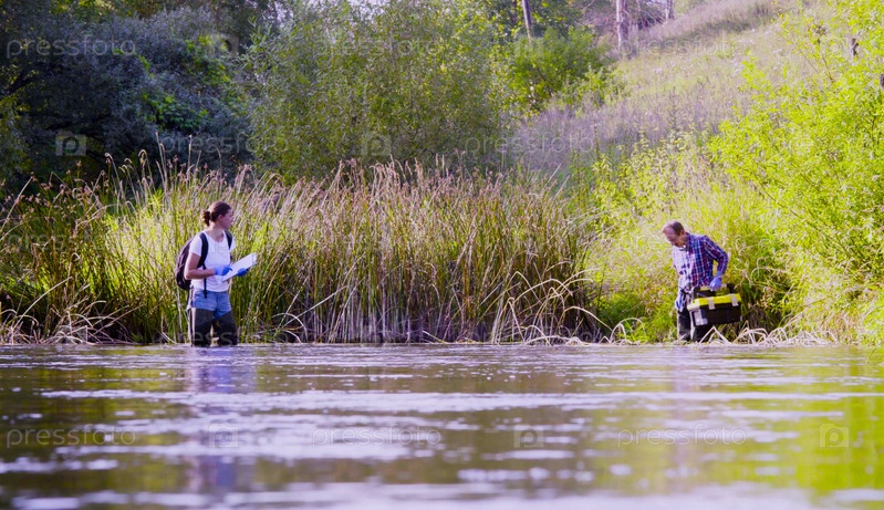 Два ученых-эколога в высоких резиновых сапогах гуляют по воде лесной реки