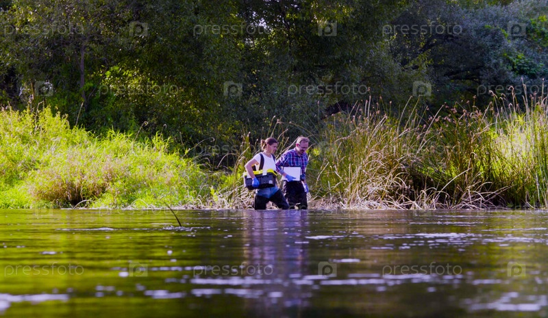 Два ученых-эколога в высоких резиновых сапогах гуляют по воде лесной реки