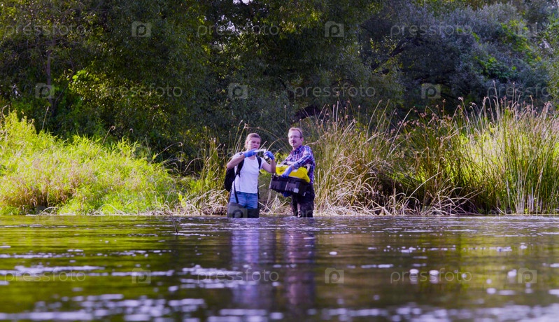 Два ученых-эколога в высоких резиновых сапогах стоят в воде лесной реки