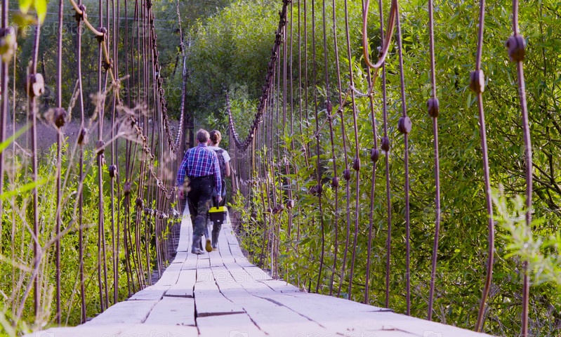 Два ученых-эколога в высоких резиновых сапогах идут по подвесному мосту