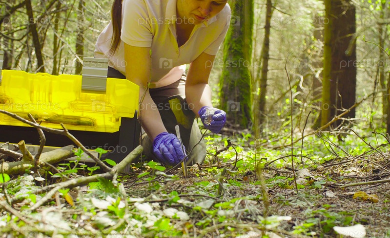 Ученый-эколог в лесу берет образцы растений