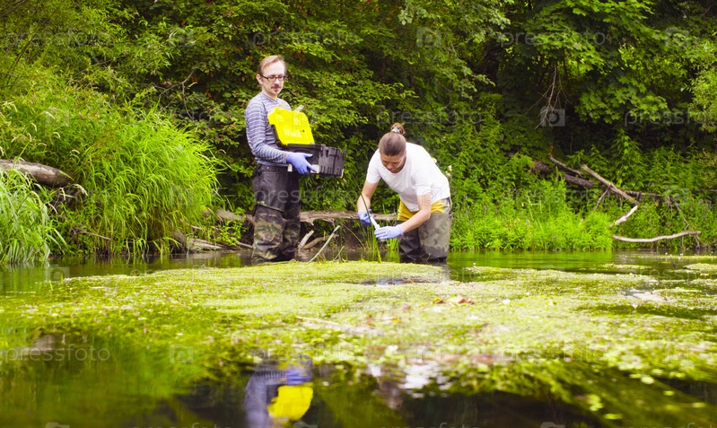 Женщина-ученый-эколог берет пробы воды