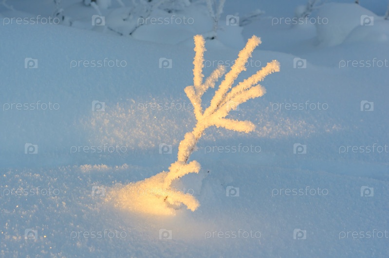 Посмотреть ветку, покрытую инеем в солнечный день. Мурманская область, Россия
