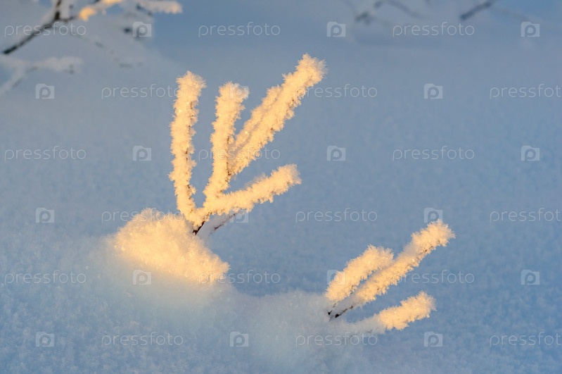Посмотреть ветку, покрытую инеем в солнечный день. Мурманская область, Россия
