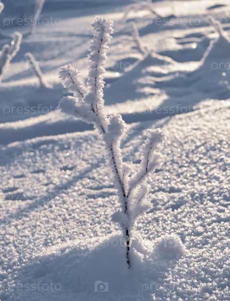 Посмотреть ветку, покрытую инеем в солнечный день. Мурманская область, Россия