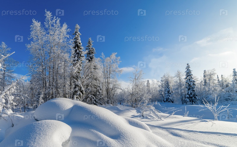 Зимний красивый пейзаж со сугробом и деревьями, покрытыми инеем. Апатиты, Кольский полуостров, Мурманская область, Россия