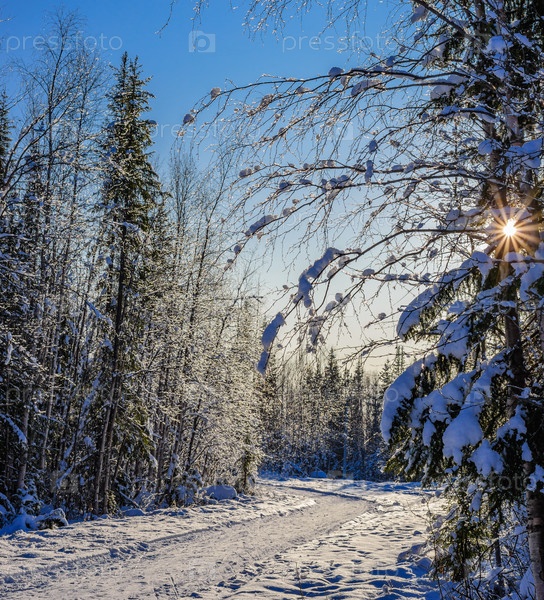 Яркий снежный пейзаж. Ледяные ветки деревьев светятся на солнце. Апатиты, Мурманская область, Россия