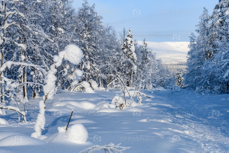 Пейзаж зимнего леса с деревьями, покрытыми снегом в солнечный день. Апатиты, Кольский полуостров, горы Хибины, Мурманская область, Россия