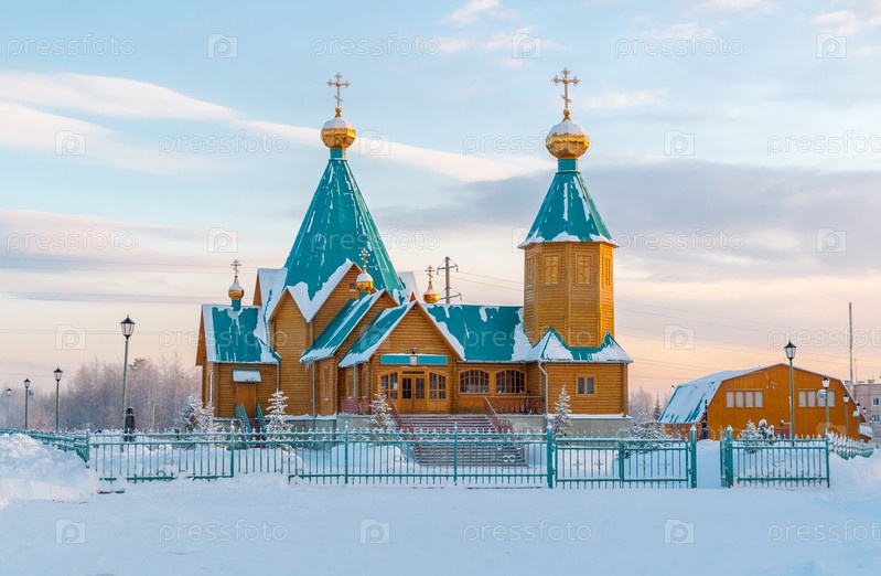 Деревянная православная «Церковь Новомучеников и исповедников Церкви Русской» зимой. Апатиты, Мурманская область, Россия
