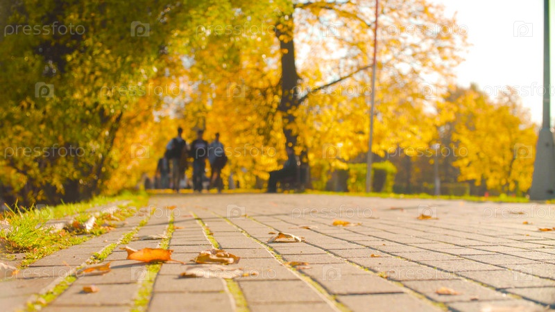 Плитка на дороге в парке, на ней цветные листья