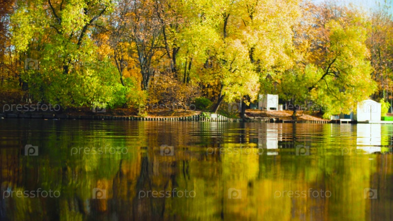 Осенний пейзаж, озеро в парке, разноцветные листья на деревьях