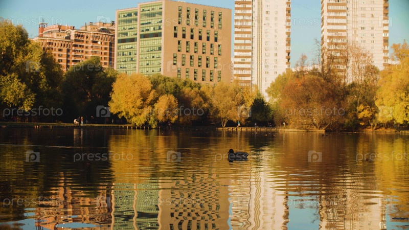 Осенний пейзаж, озеро в парке, в озере плавают утки