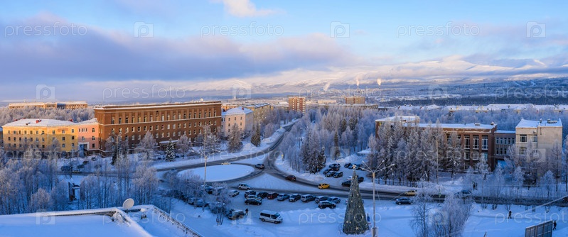 Зимняя рождественская панорама города Апатиты. Мурманская область, Россия