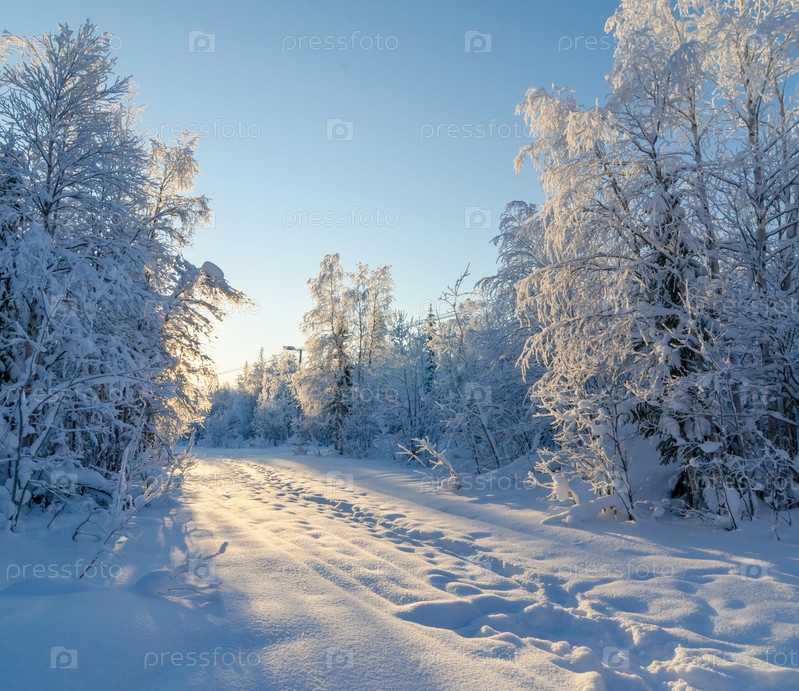 Красивый зимний пейзаж. Лес покрыт снегом и инеем в солнечный день. Мурманская область, Россия