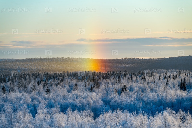 Зимняя снежная радуга (ореол) в Заполярье России. Апатиты, Мурманская область, Россия