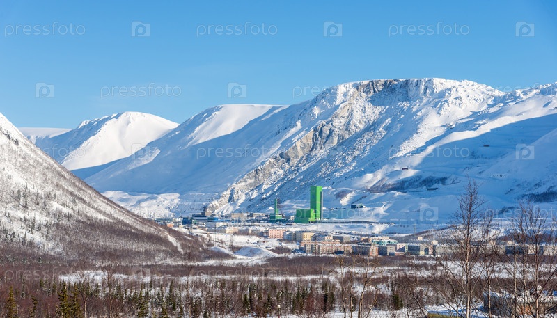Зимние виды Хибинских гор в городе Кировске. Мурманская область, Россия