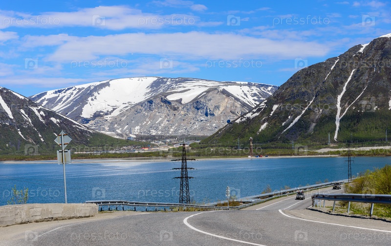 Пейзаж Озеро Большой Вудьявр и гора Кукисвумчорр. Солнечный день. Кировск, Мурманская область, Россия