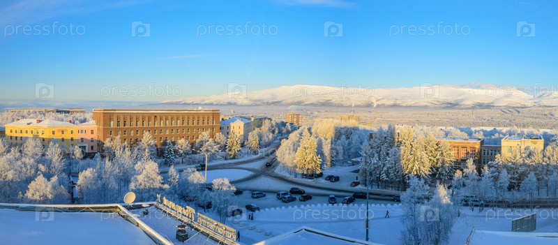 Зимняя панорама центральной площади города Апатиты. Мурманская область, Россия