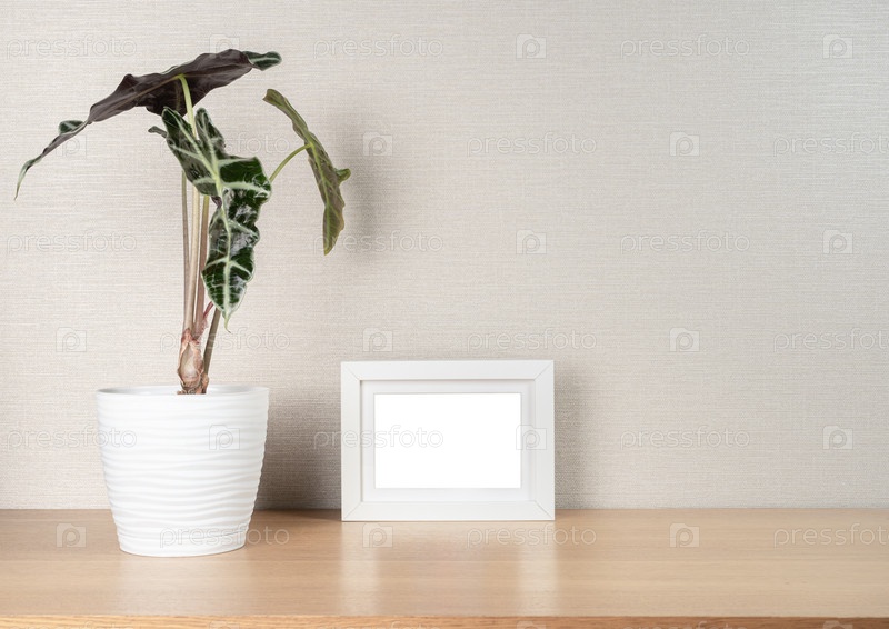 Растение Алоказия Амазоника Сандериана в белом горшке и пустая фоторамка на деревянном столе