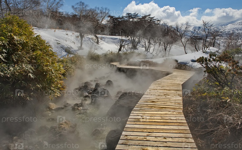 Россия. Дальний Восток, Курильские острова. Деревянный настил на знаменитой Кипящей реке острова Итуруп. Температура воды в термальном источнике достигает 80 градусов