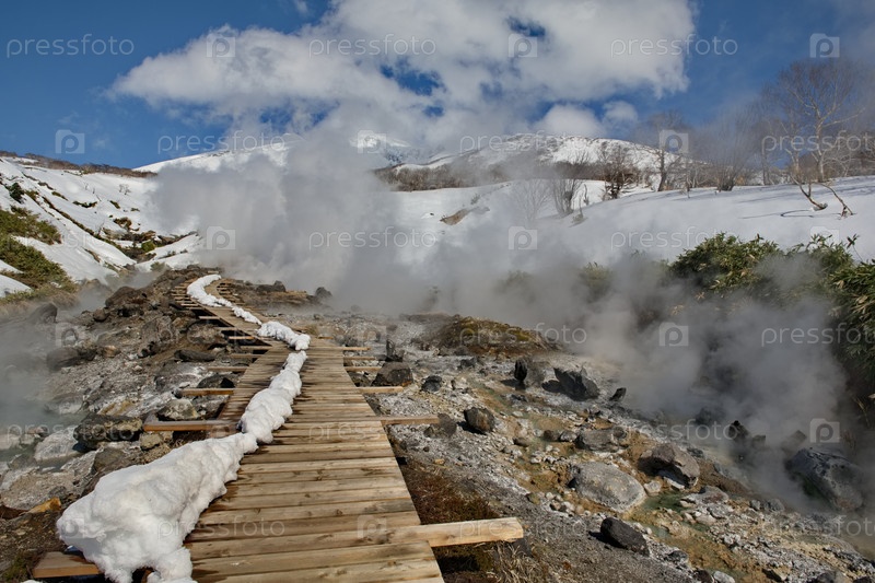 Россия. Дальний Восток, Курильские острова. Деревянный настил на знаменитой Кипящей реке острова Итуруп. Температура воды в термальном источнике достигает 80 градусов