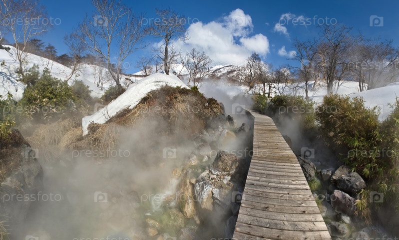 Россия. Дальний Восток, Курильские острова. Деревянный настил на знаменитой Кипящей реке острова Итуруп. Температура воды в термальном источнике достигает 80 градусов