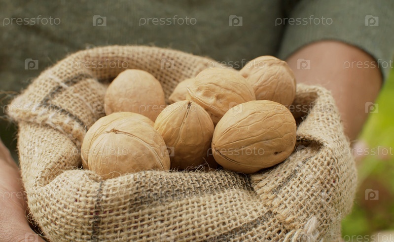Крупным планом мужские руки держат джутовый мешок с грецкими орехами. Продукт богат минералами и витаминами