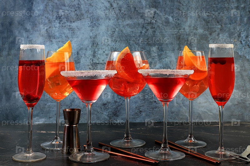 Ассортимент алкогольных коктейлей Aperol spritz, шампанского и красного мартини в стаканах на темном фоне, концепция бара, спиртные напитки на вечеринке, реклама ресторана,