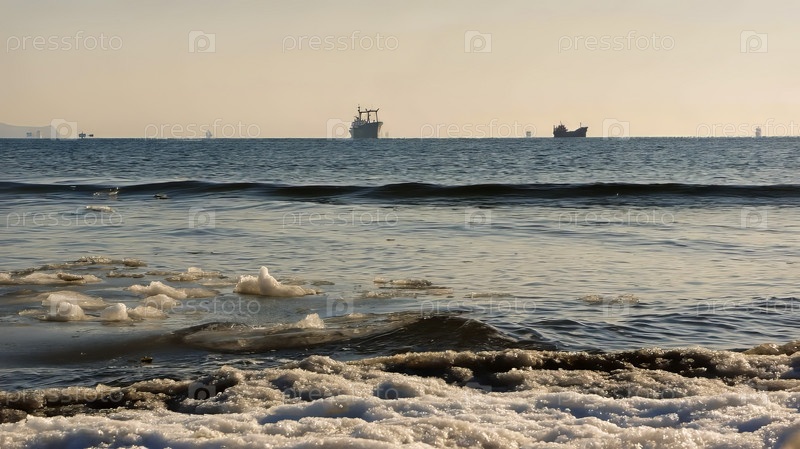 Зимний морской пейзаж с кораблями на горизонте