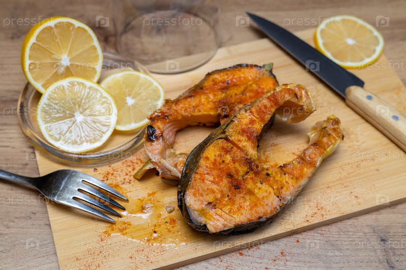 Жареная рыба и лимон на деревянной доске