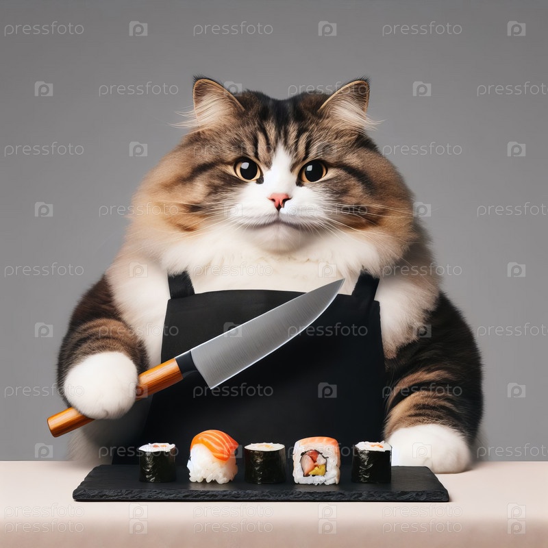 Толстый кот в фартуке с ножом в лапах готовит суши