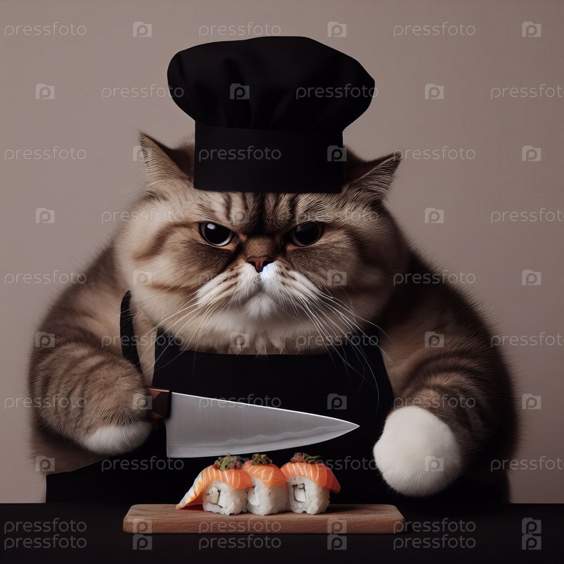 Толстый кот в фартуке с ножом в лапах готовит суши