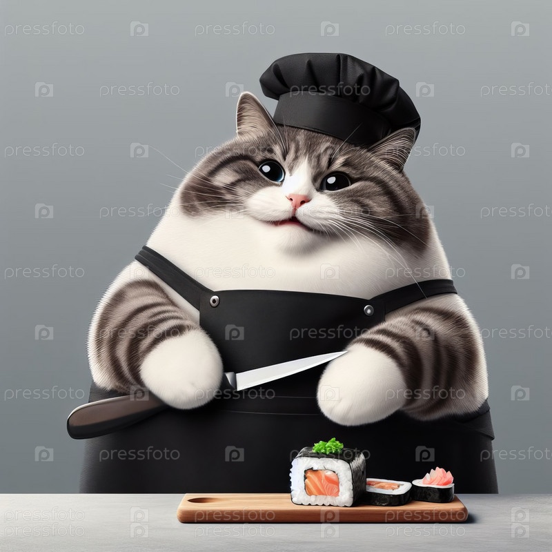 Толстый кот в фартуке с ножом в лапах готовит суши