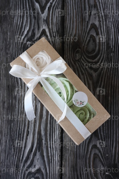 Домашний зефир в бумажной подарочной упаковке. Зефирные цветы. Коробочка перевязана лентой, завязанной в бантик. Метка для текста
